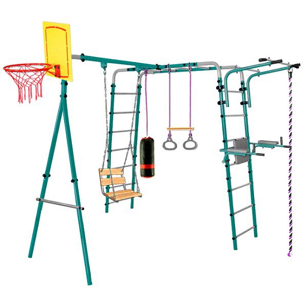 | Комплектация: | каркас из металлических лестниц с рукоходом, турник, баскетбольный щит, брусья откидные со спинкой, цепные качели, канат, кольца с перекладиной, боксерский мешок-груша |