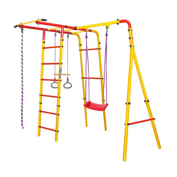 | Комплектация: | основа - каркас из металлических лестниц с рукоходом, турник, подвесные пластиковые качели без спинки, канат, кольца с перекладиной |