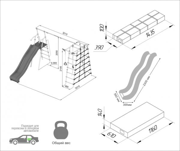 | Комплектация: | лестница металлическая двойная П-образная с рукоходом, сетка для лазания, турник неподвижный, горка пластиковая, кольца гимнастические |