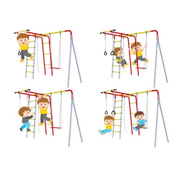 - Функциональность – в процессе оснащения шведской стенки применяются разнообразные спортивные снаряды: турники, гимнастические кольца, канаты, лестницы и прочее. Сбоку можно повесить баскетбольное кольцо, качели, установить горку или закрепить боксерский мешок.