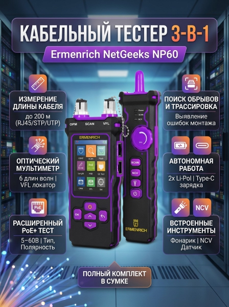 Многофункциональный кабельный тестер Ermenrich NetGeeks NP60, фиолетовый - Описание