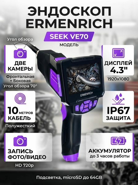 Купить видеоэндоскоп Ermenrich Seek VE70, фиолетовый по эксклюзивной цене от официального дилера. Профессиональные консультации.
