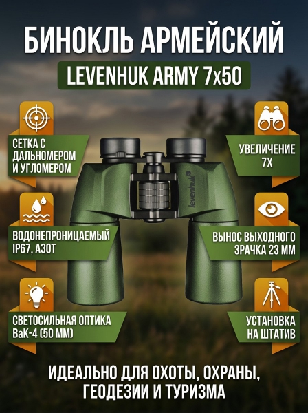 Купить военно-полевой бинокль Levenhuk Army 7x50 с сеткой по эксклюзивной цене от официального дилера. Профессиональные консультации.