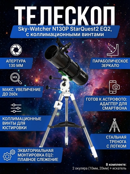 Телескоп Sky-Watcher N130P StarQuest2 EQ2, с коллимационными винтами - Доставка
